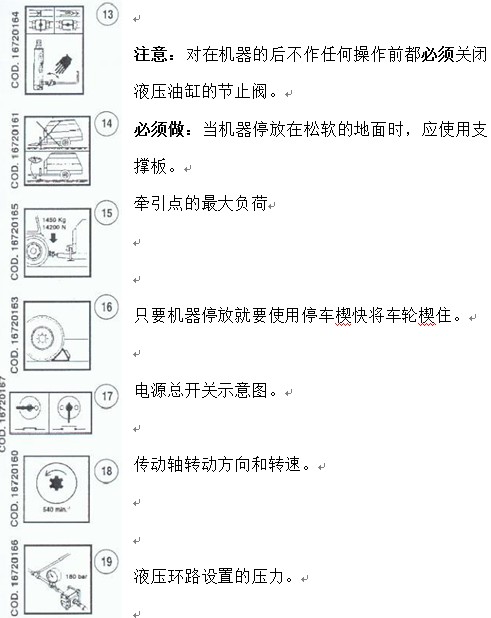 13. 机器运转或与拖拉机动力输出轴相连时,不能进行保养或维修等工作。