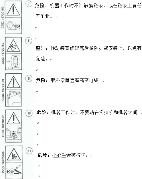 6. 机器运转或与拖拉机动力输出轴相连时,不能进行保养或维修等工作。